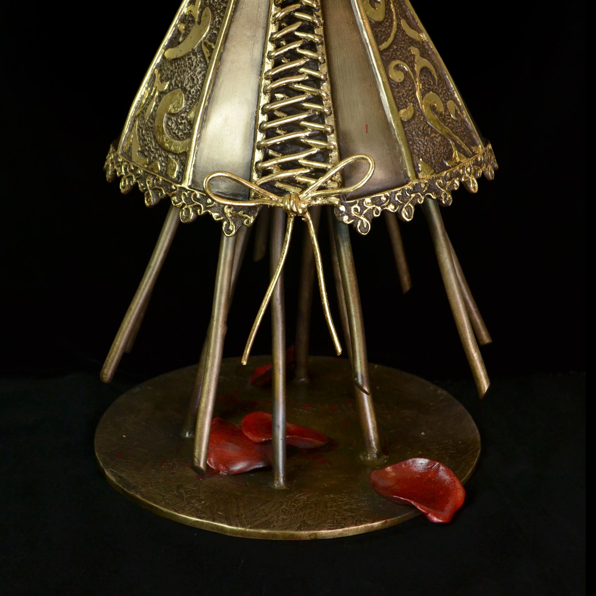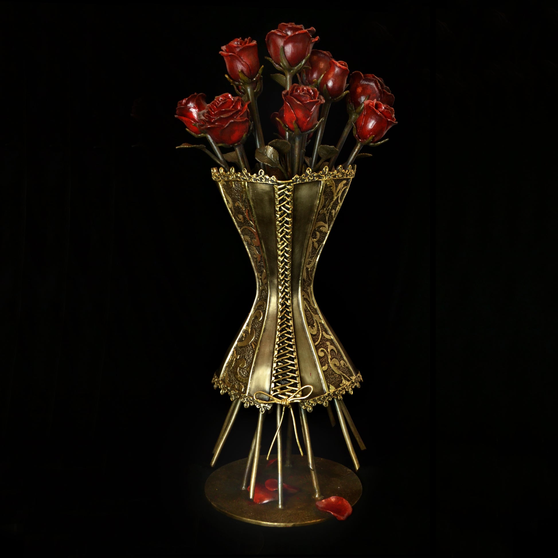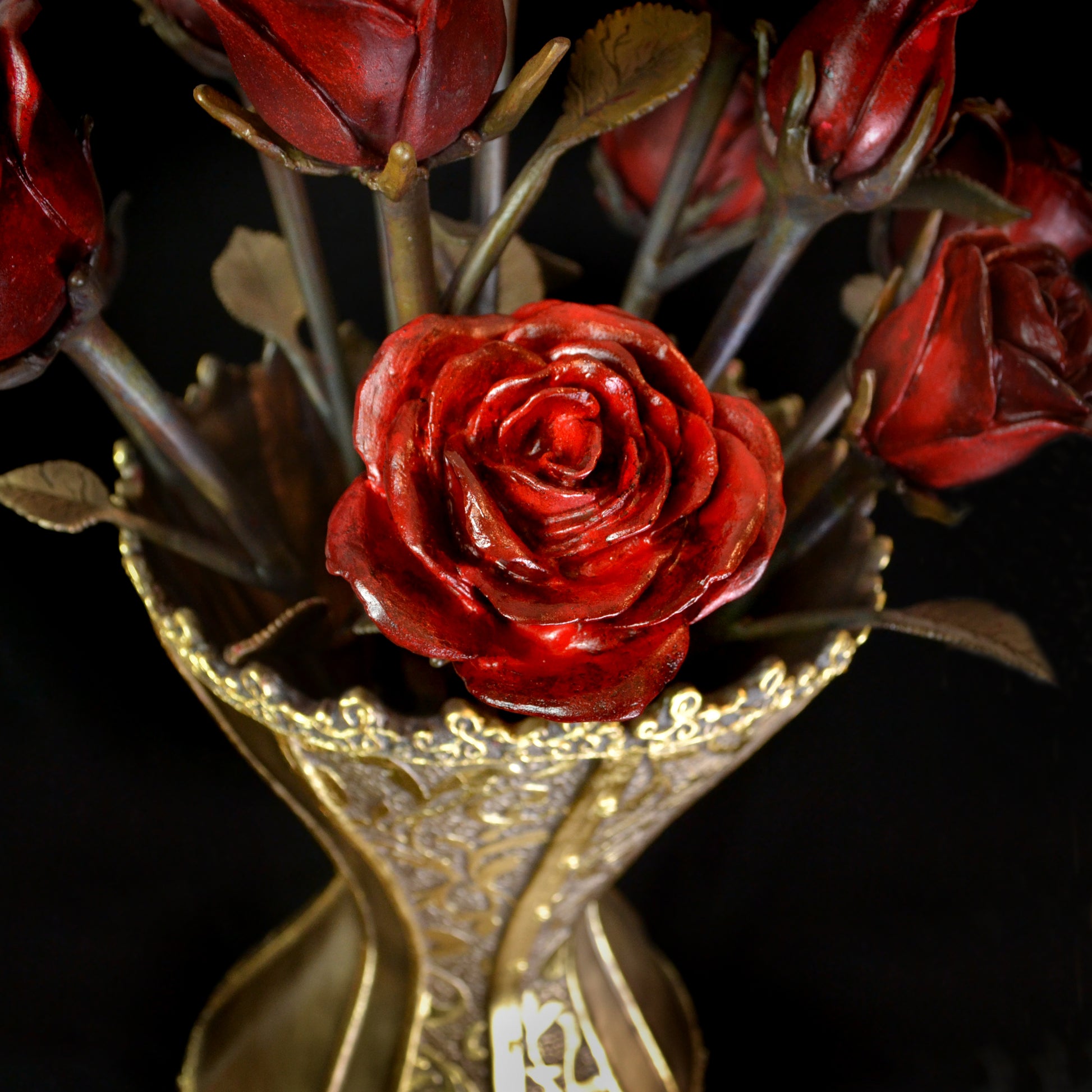 This bronze sculpture has gold leaf accents and beautifully hand painted roses.