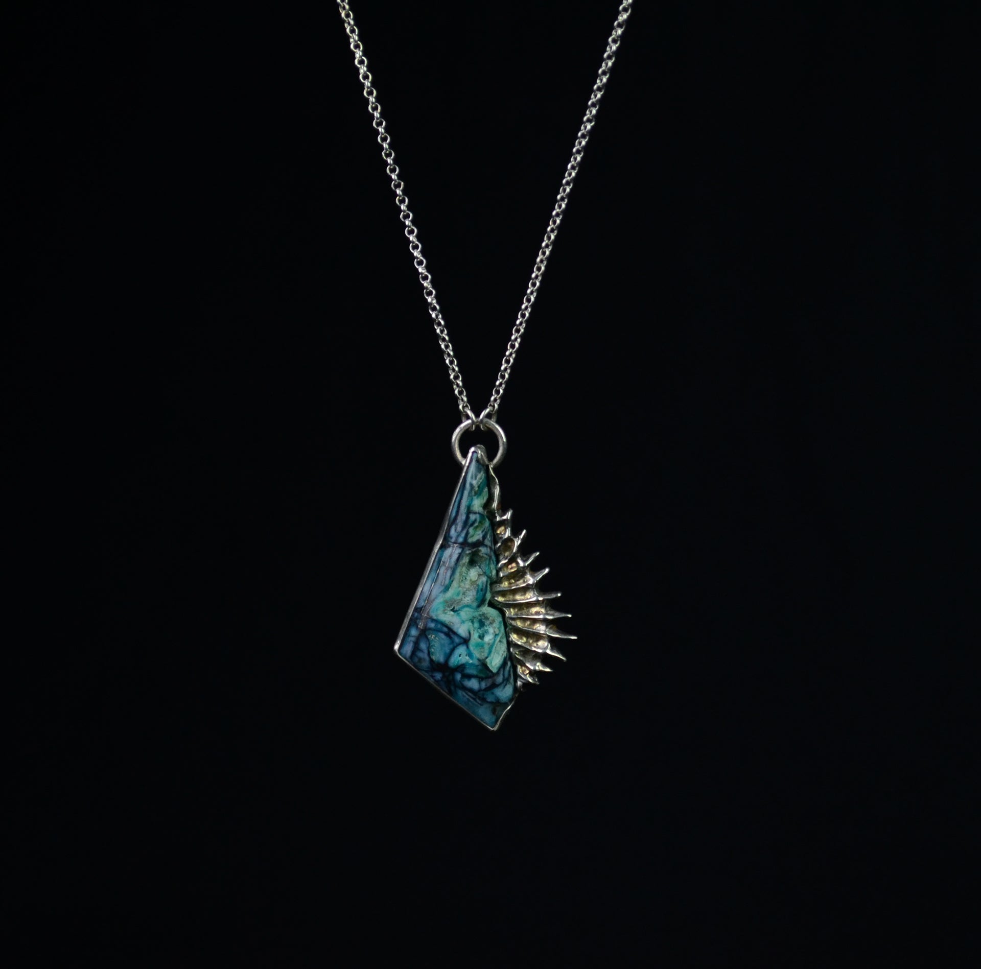 This Copper Chrysocolla necklace is a one-of-a-kind-piece that has the most intricate vein patterning of different blue and teal hues. Each void of the sculptural cast sterling silver has 14k gold solder dropped in to create a two toned style I've been loving lately.