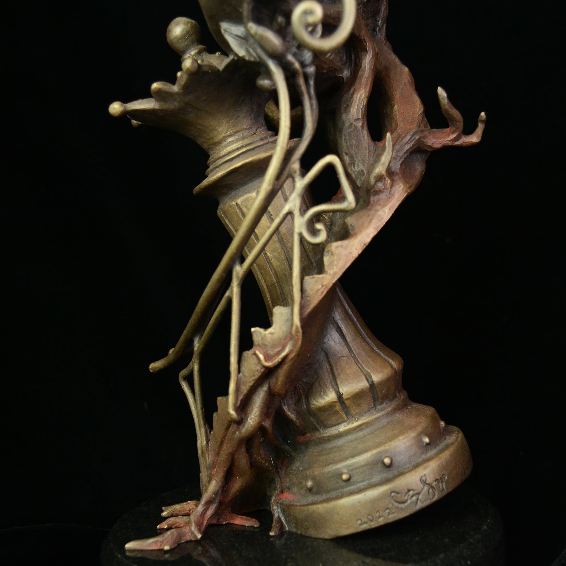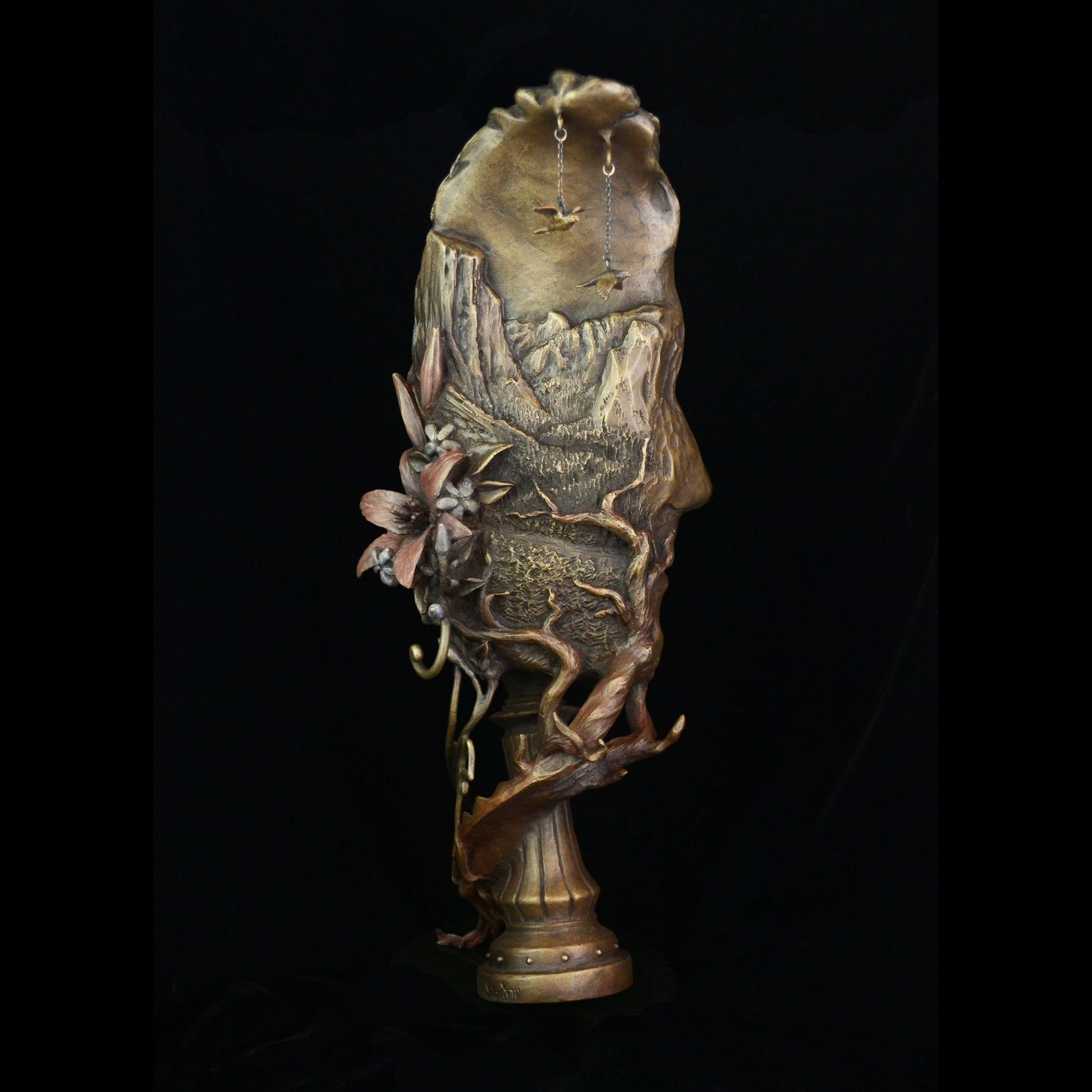 I began creating the face of this piece working with John in Sedona. At first it was just my father's face. I spent the following 2 years designing the rest of the piece as a representation of my love for my family. The portrait itself is my father. He's an amazing, charismatic, loving man. I couldn't be a luckier daughter to have him and my mother as my parents. In this piece, my mother is represented by the lilies and jasmine as well as being the queen chess piece that holds our family up. My mom is the strongest woman I've known and she's where I get all of my determination and drive. My brother is represented by the chess aspect as well as one of the birds flying above the tree. He was a chess champion when we were kids and although he doesn't play much anymore, we share a love of strategic games and chess is the ultimate example of that. The spiral staircase represents our journey as a family to always strive to do better and grow together. The tree is the actual tree that was outside my studio in Davenport when I was creating this piece. It's representative of my family outside of blood. My community has become family and I couldn't possibly create this piece without including them. This tree was a central part of our neighborhood. Our landlord actually cut it back when I was designing this and some of my neighbors and I were nearly brought to tears. It was so hideous and hard to look at. This beautiful willow had transformed into a chopped up mess of bare branches. Over the 2 year pandemic, it started to grow back and it was a reminder that sometimes although pruning is harsh and ugly and scary it allows you to grow back stronger and even more glorious than before.