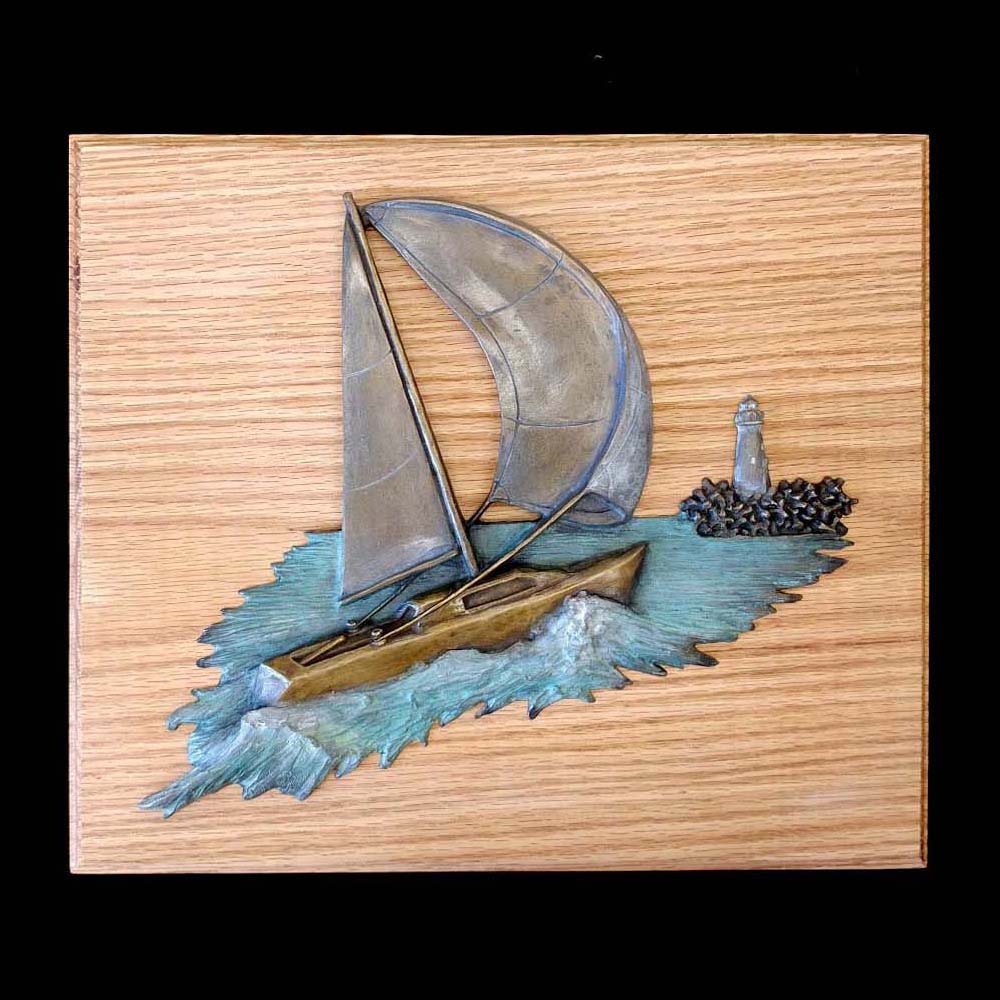 This bronze boat relief is based on an an amalgamation of all the different types of sail boats that were designed and built in Santa Cruz. I initially created this relief for the plaque that resides outside the Santa Cruz Yacht Club on 4th Street.