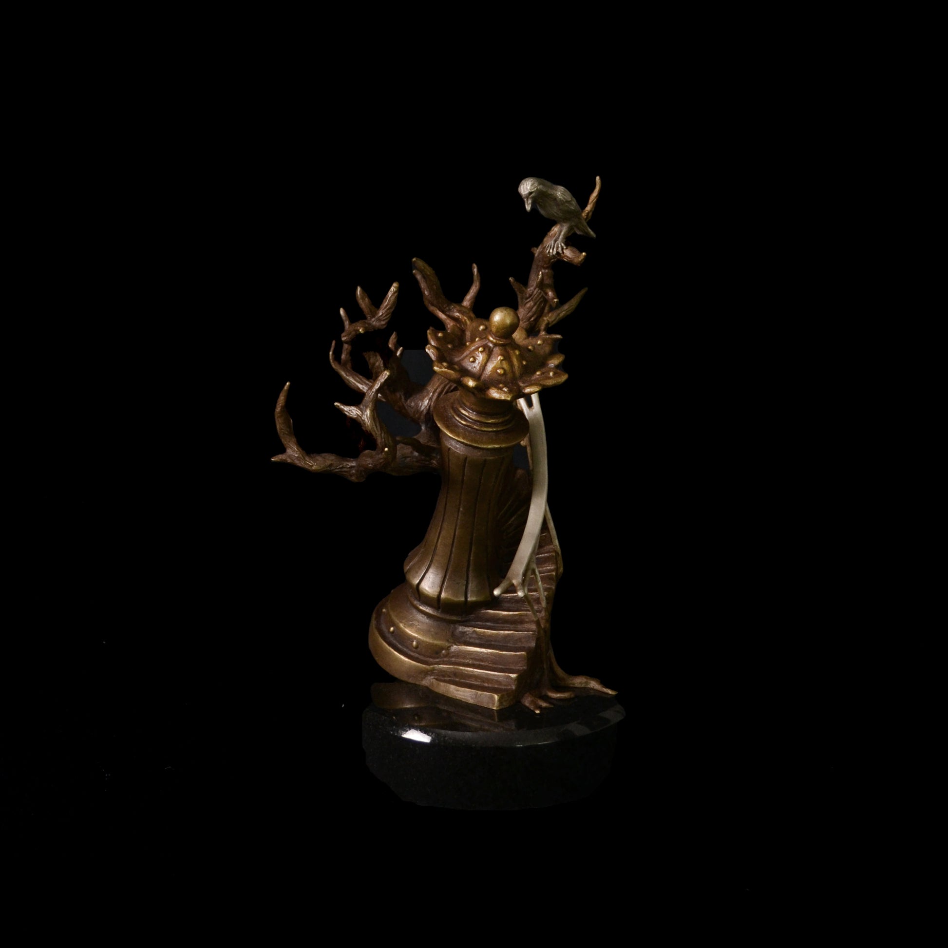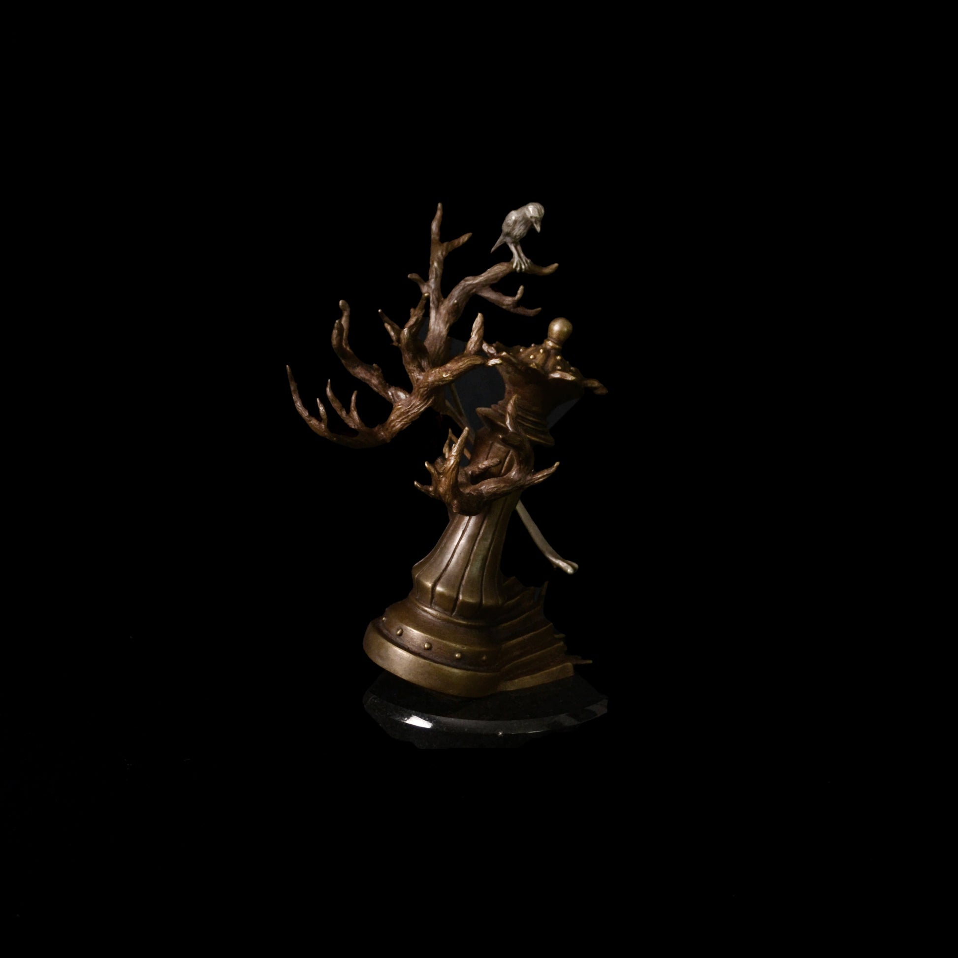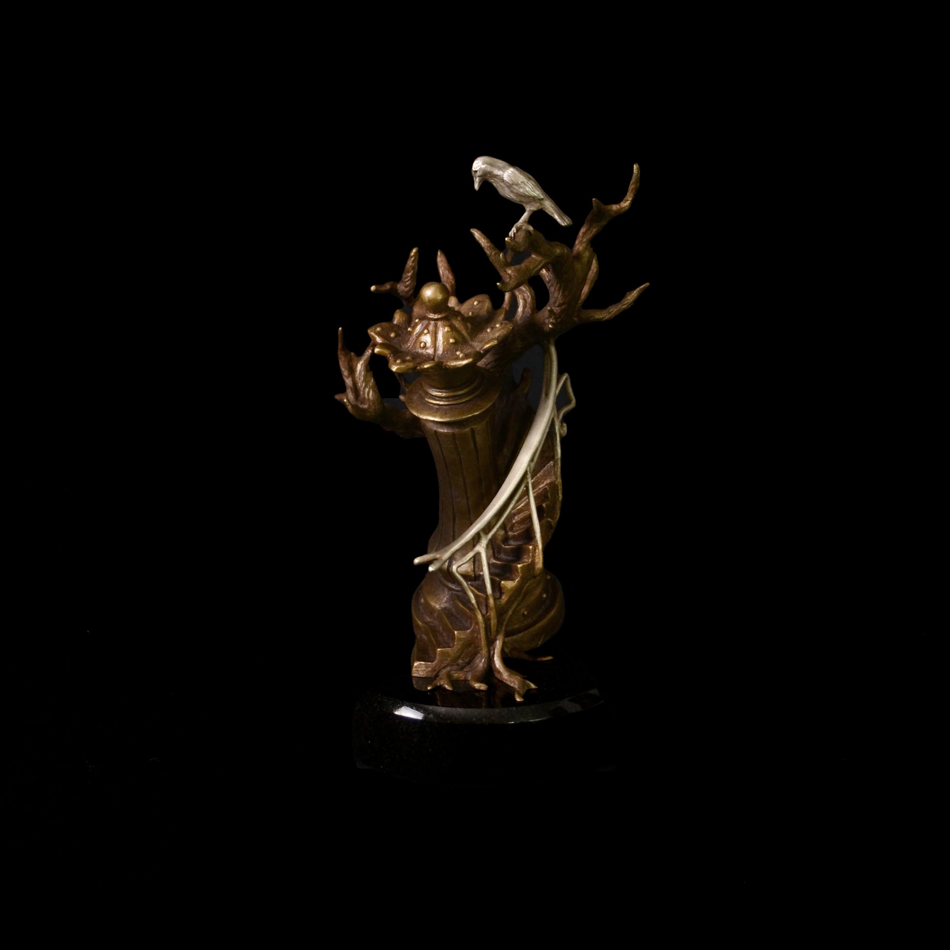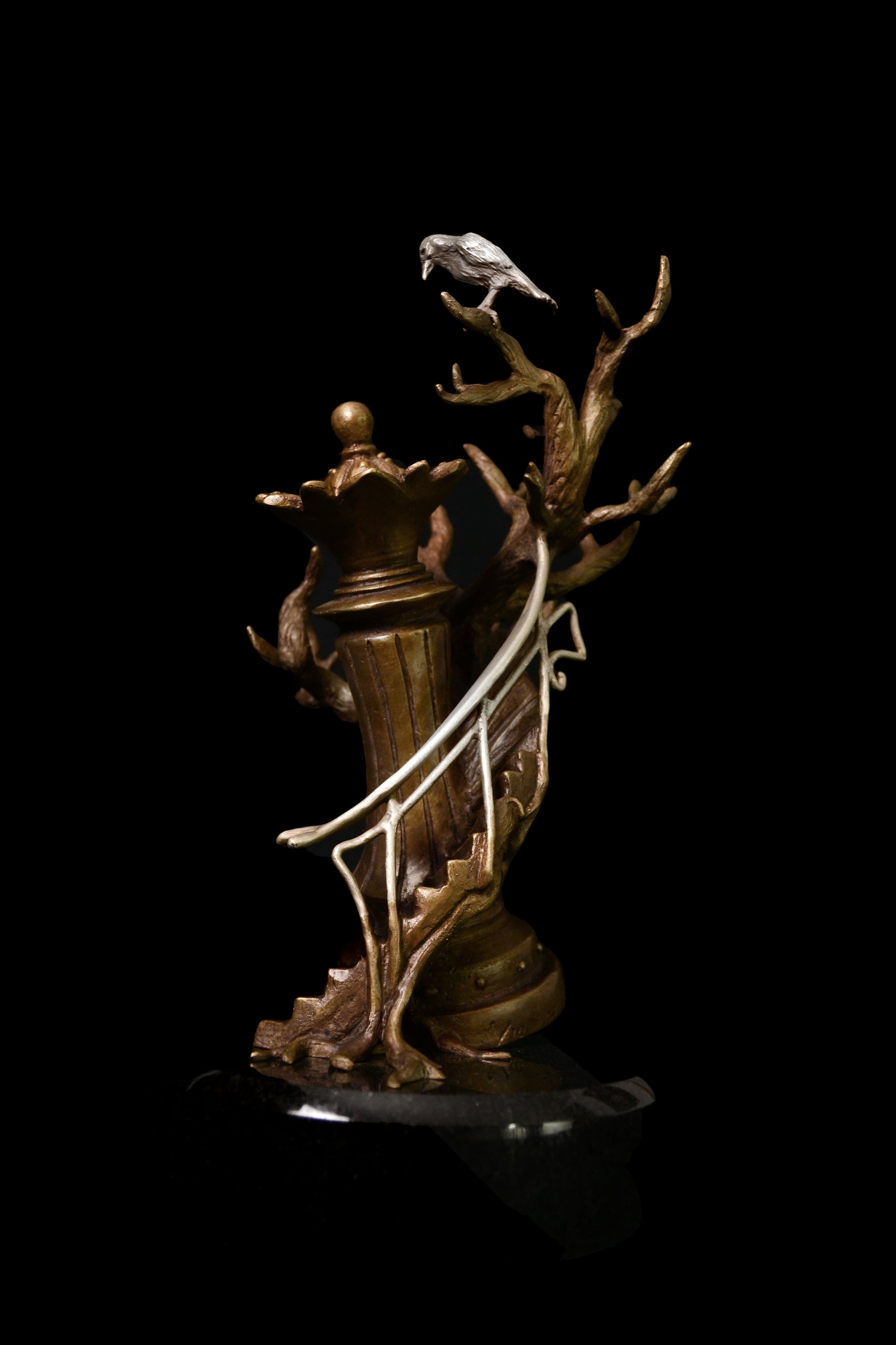 As far as the materials are concerned, this particular piece is made of bronze with a sterling silver hand railing and crow. The base is black granite. I really enjoyed playing with the different materials on this one and look forward to more of this in the future.