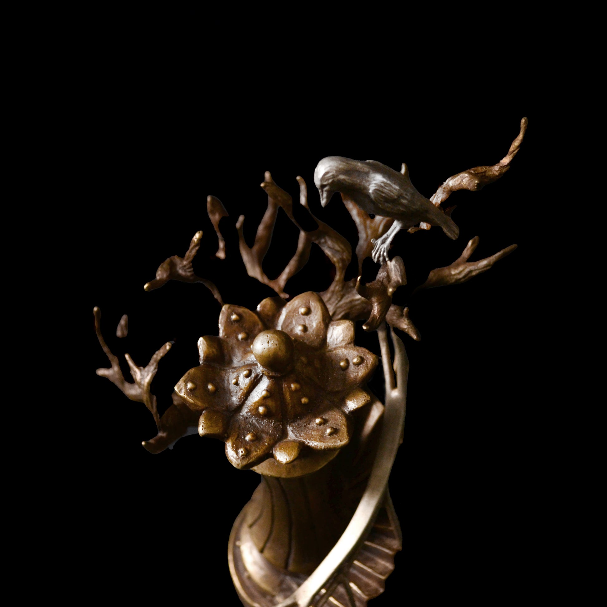 I would say that pretty much sums it up but it doesn't, does it? This piece obviously started with the adage, "Necessity, the mother of all Invention" but then it took a turn. As I thought about it, I picked apart the bit about mother and what that means today. My mother was and is a strong, proud defiant woman who certainly created things when necessary. She could come up with a solution to any problem with what she had lying around and nothing would stand in her way. She needed a floor, she learned how to tile. She needed a gazebo, she went to the lumber store and learned as she went. No one could tell her she couldn't and although she was short, she oversaw everything that happened in our household with a sense of meticulous perfection that made me what I am today. So back to the adage, who is the mother of all invention. To me, her name is Necessity and she happens to take on the form of a crow. She proudly looks down on all that she's built. A story helps us to remember our morals and values in our culture and this bronze piece puts a physicality to the abstract thought of creationism.